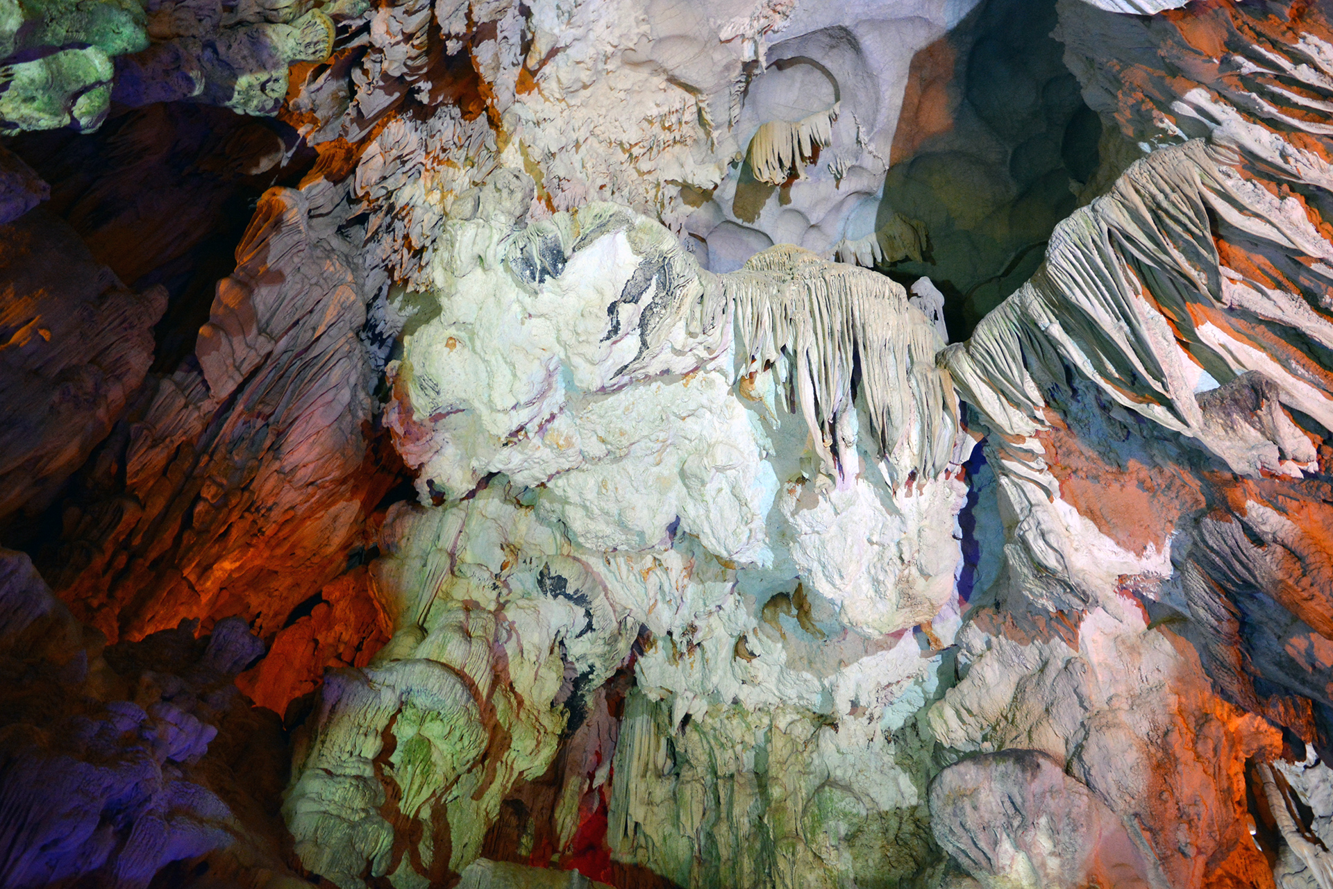 The rock formations are pretty interesting, but with all those multi-colored lights it felt like a strip dancer’s gonna pop up from behind a rock and start spinning around a stalactite. Or a stalagmite? I never got those right. Or maybe both, if she had the right skills. Now that would’ve been awesome, and it would’ve also explained how it earned its reputation as the “Surprise Cave”.